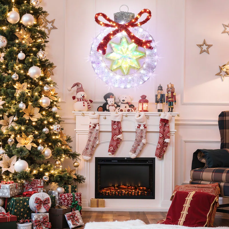 Add festive charm to your holiday decoration with this 2Ft lighted silver tinsel ornament, featuring a radiant star centerpiece and a red bow accent for a classic Christmas look.Pre-lit with 120 warm white LED lights, it glows beautifully indoors or outdoors, creating a magical holiday ambiance. The shimmering silver tinsel, accented with a red bow and silver top, enhances its ornament-like design, making it a standout decorative piece. Crafted with durable metal and tinsel plastic, it ensures long-lasting seasonal use. Plug-in powered for steady illumination, this wreath is easy to install and perfect for hanging on doors, windows, walls, or festive displays.