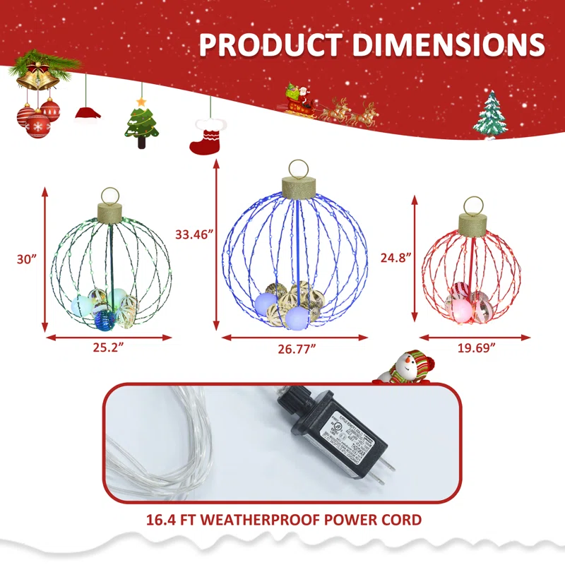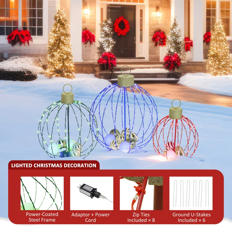 - You’d love this pre-lit ball set Christmas decor if you are finding something attractive and decorative for the coming winter holiday! This lighted ball set ornament would be the perfect decoration not only indoors but also outdoors with ground stakes, zip ties, a 3-prong water-resistant power cord, and an adaptor that makes it more stable and durable for the outside. Attention: This outdoor Christmas decoration is not supposed to be used on heavy windy or rainy days.