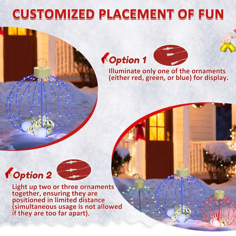 - This pre-lit lighted ball set ornament for the outdoor yard is such a suitable decoration for Christmas because of its appearance design with small balls inside. The lighted ball set ornament includes red one, blue one and green one are separate pieces, they are not attached as a group, and you can use your imagination to place them apart. Enjoy your family gatherings, parties, and Christmas winter holiday with this lighted ball set ornament!