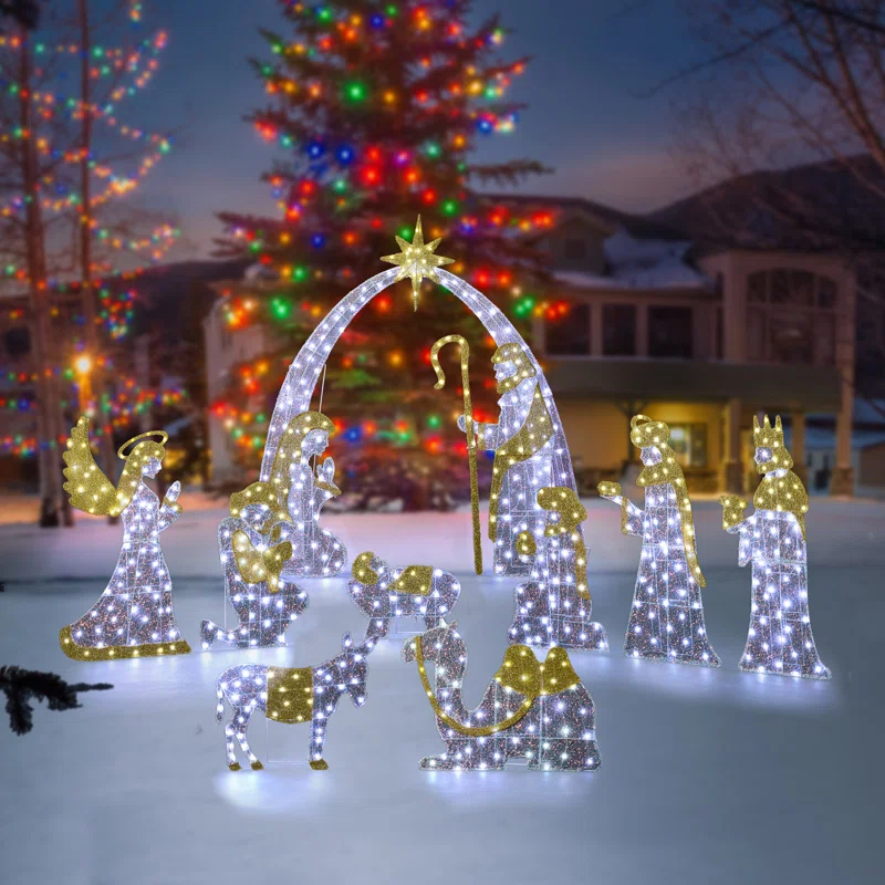 The Set of 11 Lighted Christmas 2D Iridescent Fabric Nativity Scene Outdoor Decor is a captivating holiday display featuring a variety of figures, including Mary, Joseph, baby Jesus, and more, all beautifully adorned with white and gold lights that bring the scene to life against the backdrop of your home.